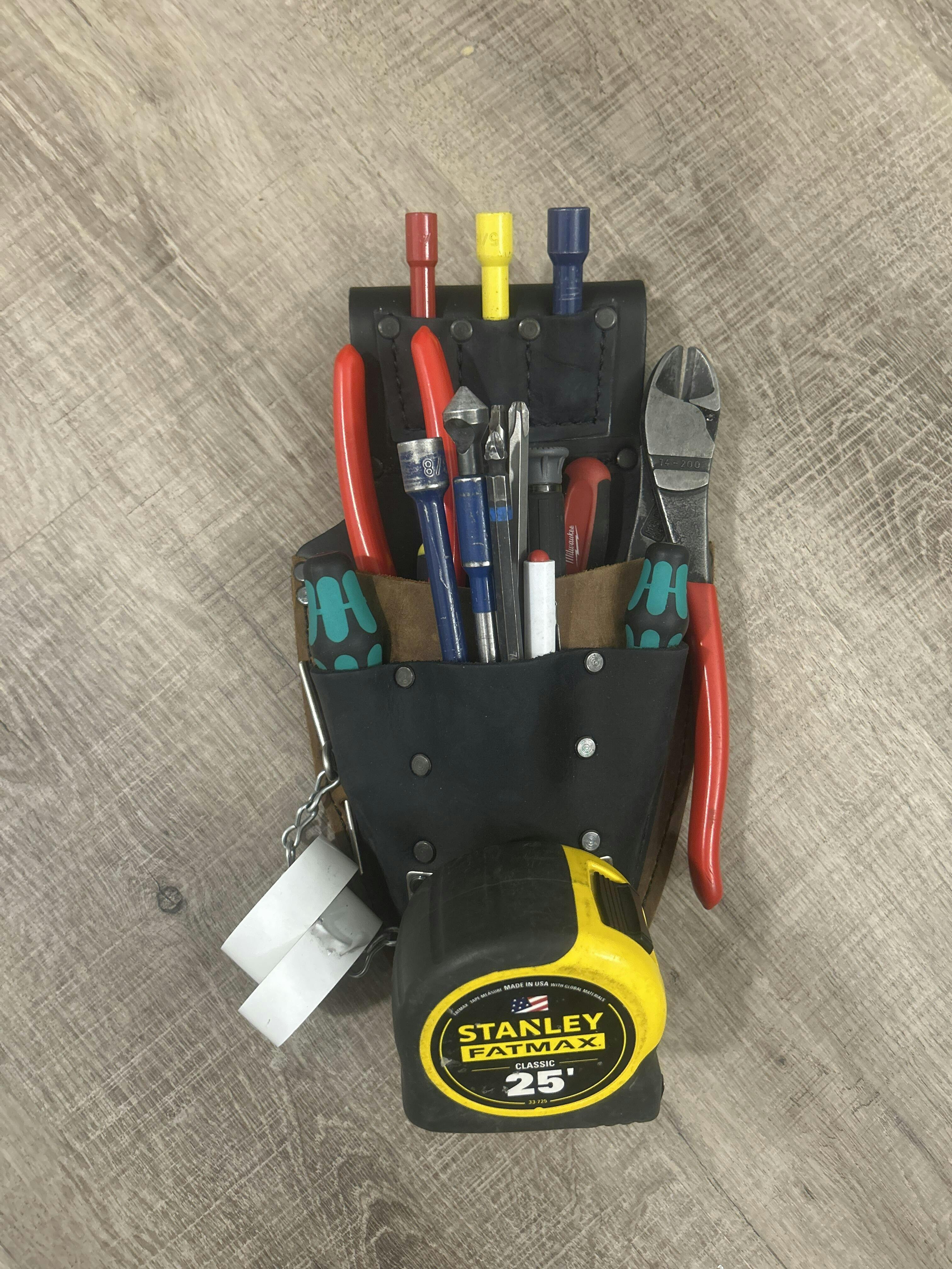A simple, compact solution for electricians. Built with input from the electrical community, this bag keeps your essential tools organized without the bulk, perfect for trim work. It includes a three-slot driver index, a tape chain, and a divided main compartment for your go-to tools.